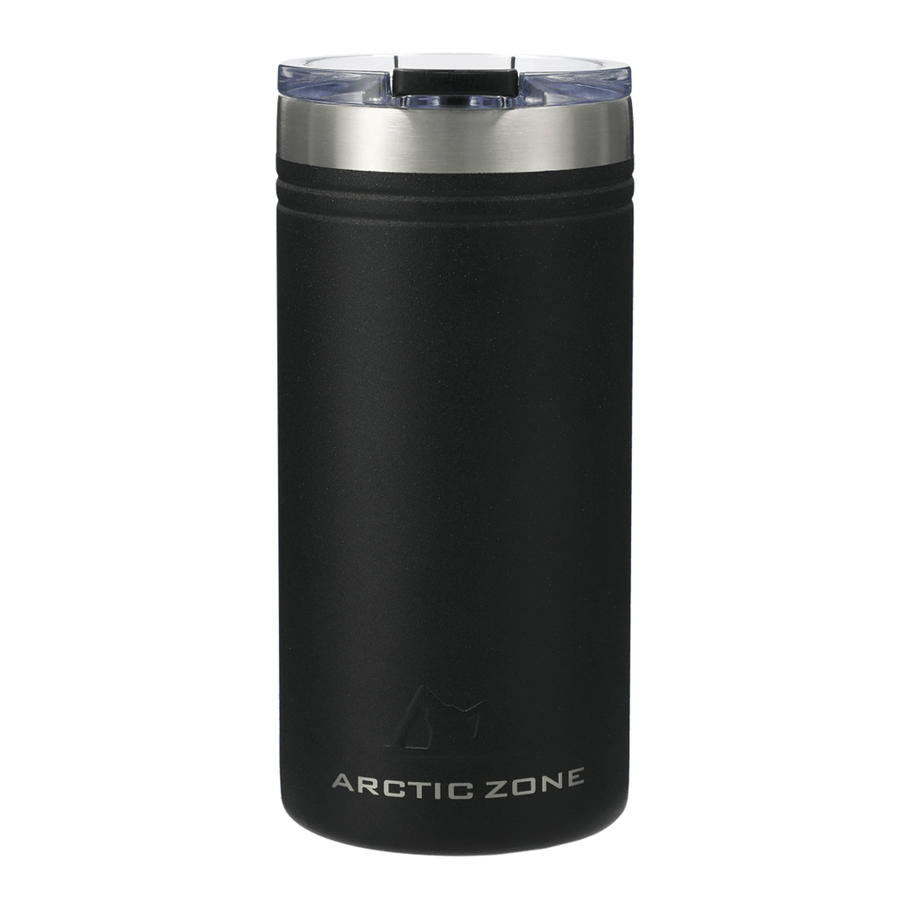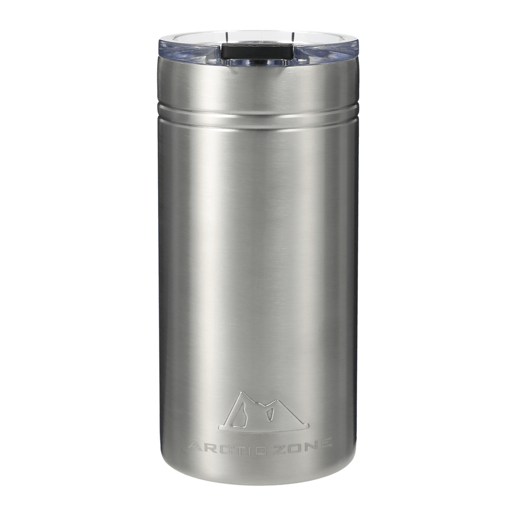 Enjoy a beverage by drinking through the push-on lid with slide closure, or place a slim can inside the tumbler. You choose! Durable, double-wall stainless steel vacuum construction with copper insulation, which allows your beverage to stay cold for 24 hours and hot for at least 8 hours. The construction also prevents condensation on the outside of the tumbler. On-trend, durable powder coating. Wide opening for comfortable filling and pouring. 12oz.