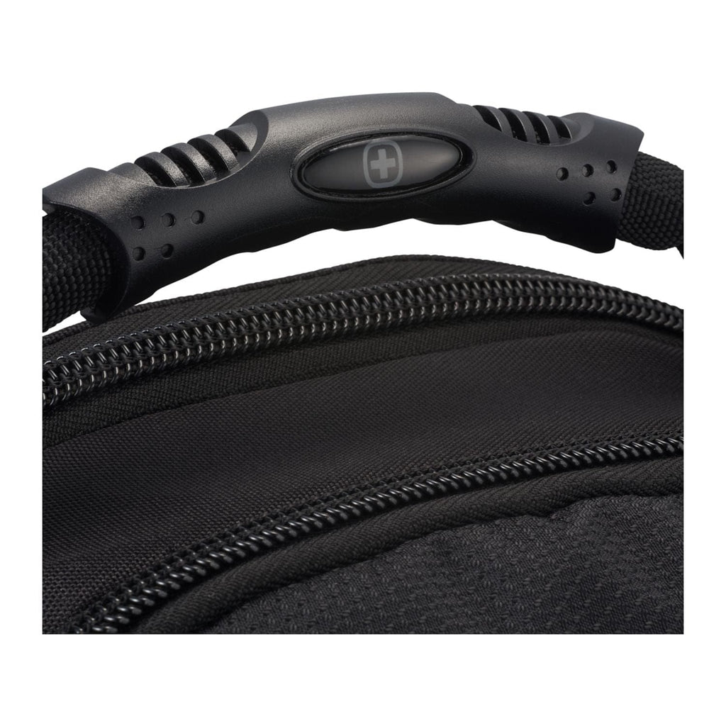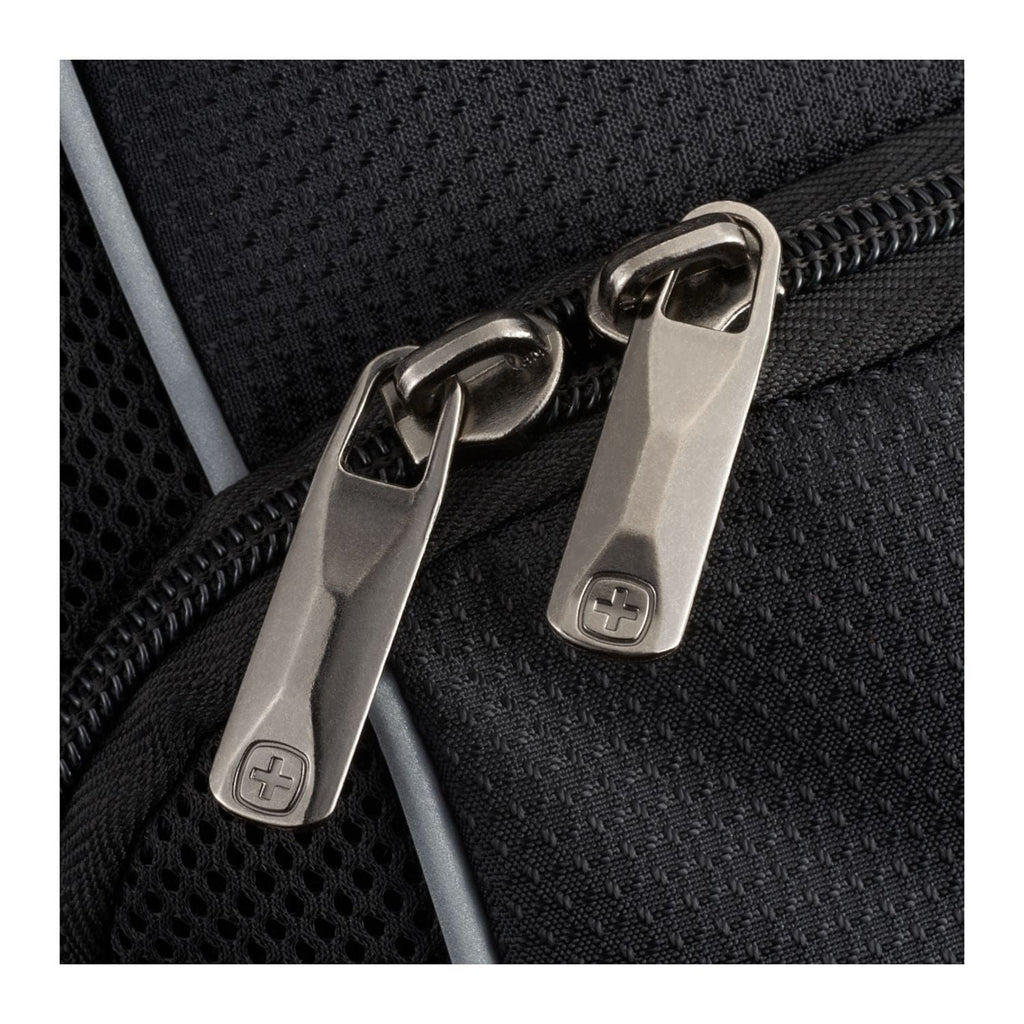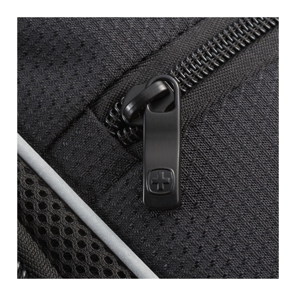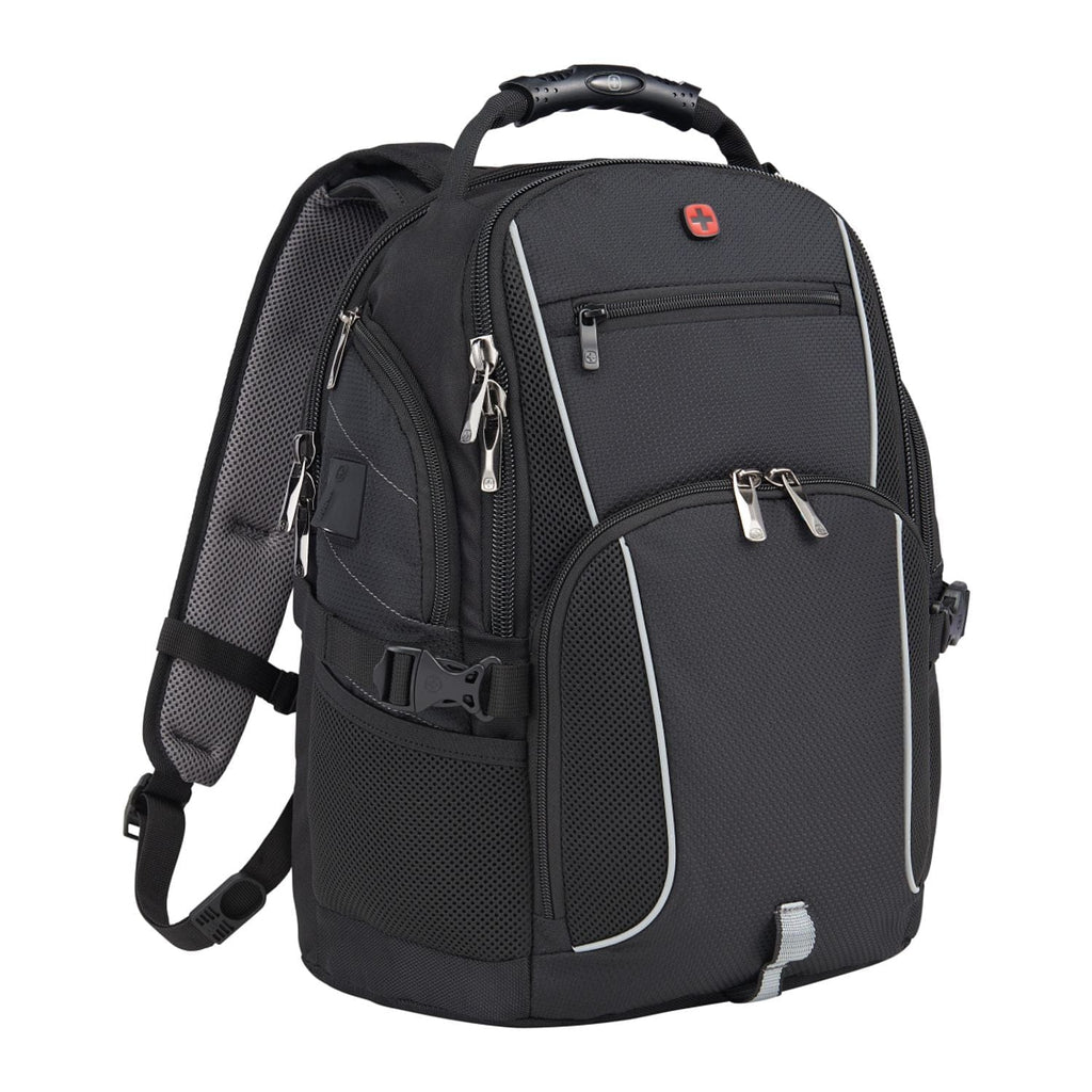 The Wenger Pro II 15'' Computer Backpack combines style and luxury and is made from RPET. This backpack has it all, a 15” computer sleeve, dedicated USB port with cable compartment, adjustable buckle compression straps, two side mesh water bottle pockets and a dedicated phone pocket on the shoulder strap. Organize your belonging in the easy access, lined front valuables pocket, the zippered mesh pocket on the interior front wall, front organizational pocket, back pocket with RFID protection or in the large zippered main compartment. This backpack features Wenger’s Airflow moisture-wicking mesh, shock absorbent backpack strap and an adjustable chest strap.