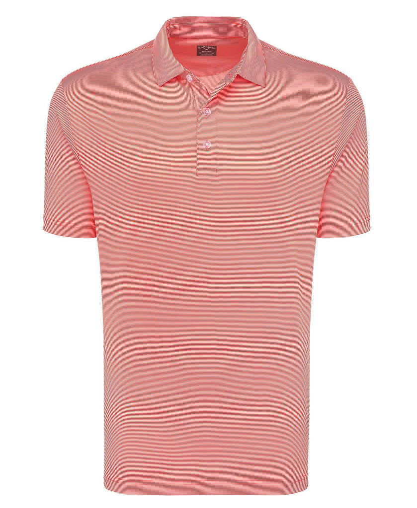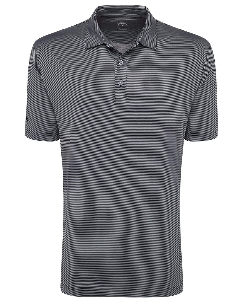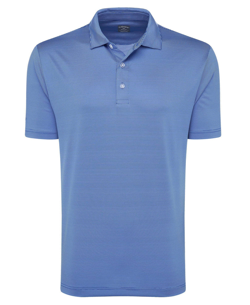 5.2 oz 92% polyester / 8% spandex yarn-dyed knit jersey stripe. Opti-Dri technology transfers moisture away from the body to keep you cool and dry. Stretch to give full range of motion. UV Repel technology keeps skin safe from the sun's harmful rays. UPF 30+. Self-fabric collar with edge stitch. Double needle hemmed bottom with side vents. 3-button placket with top and bottom placket edgestitch with Callaway embossed buttons. Heat seal label provides tag-free comfort. Contrast embroidered Callaway logo on right sleeve.