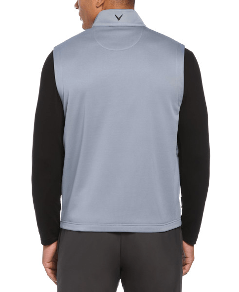 7.4 oz 100% polyester quilted woven fabric at center front and brushed knit back. Thermal fabric provides an extra layer of warm comfort. UV Block technology keeps skin safe from the sun's harmful rays. Water repellant fabric on front-body only. Full-zip with reverse coil zipper with Callaway Chevron on pull. Front open pockets. Heat seal label provides tag-free comfort. Contrast heat seal Chevron on back collar.