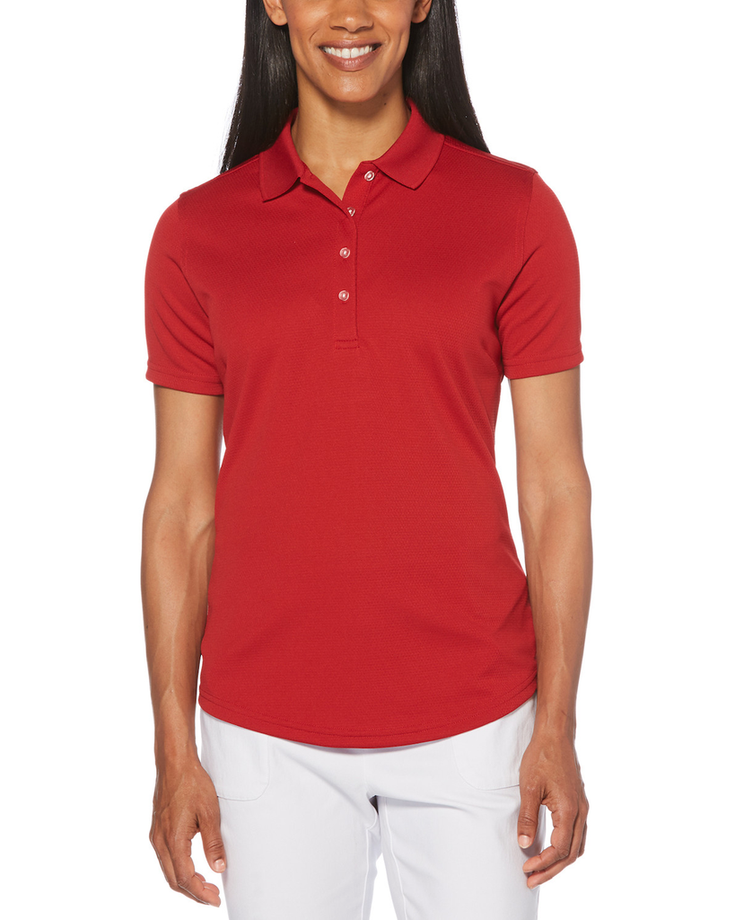 5.6 oz 100% polyester double knit mesh fabric. Opti-Dri technology transfers moisture away from the body to keep you cool and dry. Rib knit collar and open sleeve. 4-button slim line placket with Callaway embossed buttons. Front darts add contour. Rounded bottom with double needle hem. Heat transfer Chevron logo on back neck.