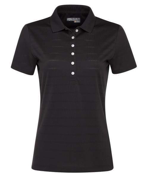 5.3 oz 100% polyester pique mesh stripe knit fabric. Opti-Dri technology transfers moisture away from the body to keep you cool and dry. Ventilated fabric allows air to flow freely through the fabric to keep you comfortable. Rib knit collar. 6-button placket with Callaway embossed buttons. Double needle hemmed bottom with side vents. Heat seal label provides tag-free comfort. Contrast embroidered Chevron on back neck.