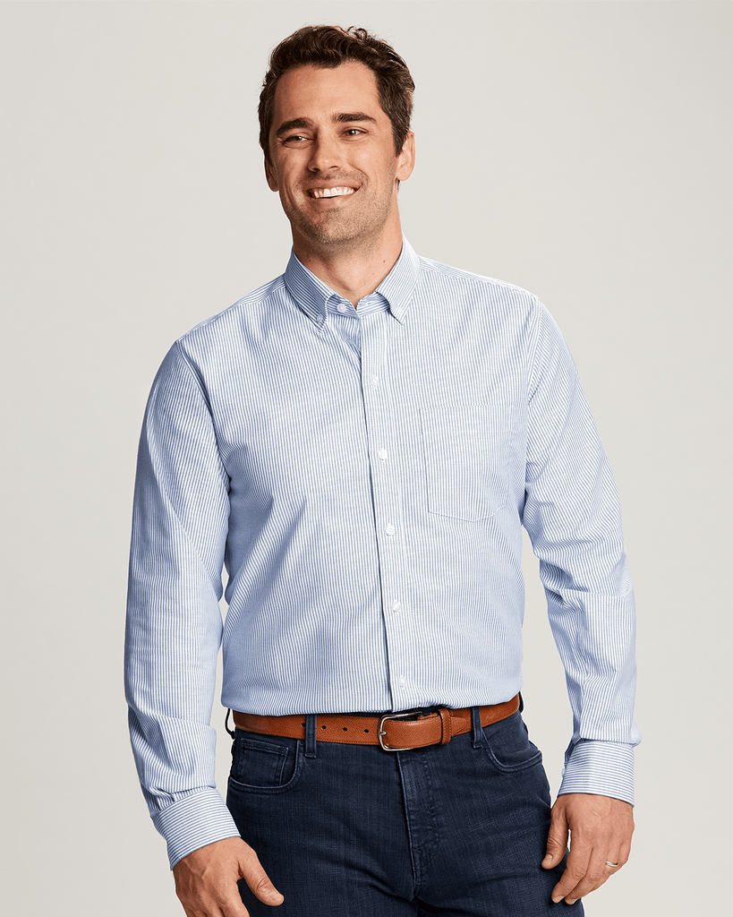The iconic Stretch Oxford Stripe button down is engineered for exceptional versatility, designed to be your favorite men's long sleeve striped dress shirt for the office, WFH, or coffee meeting.  Perfect for busy days, our high quality Easy Care Stretch fabric is super comfortable, with crispness, and it’ll look great right-out-of-the-dryer.