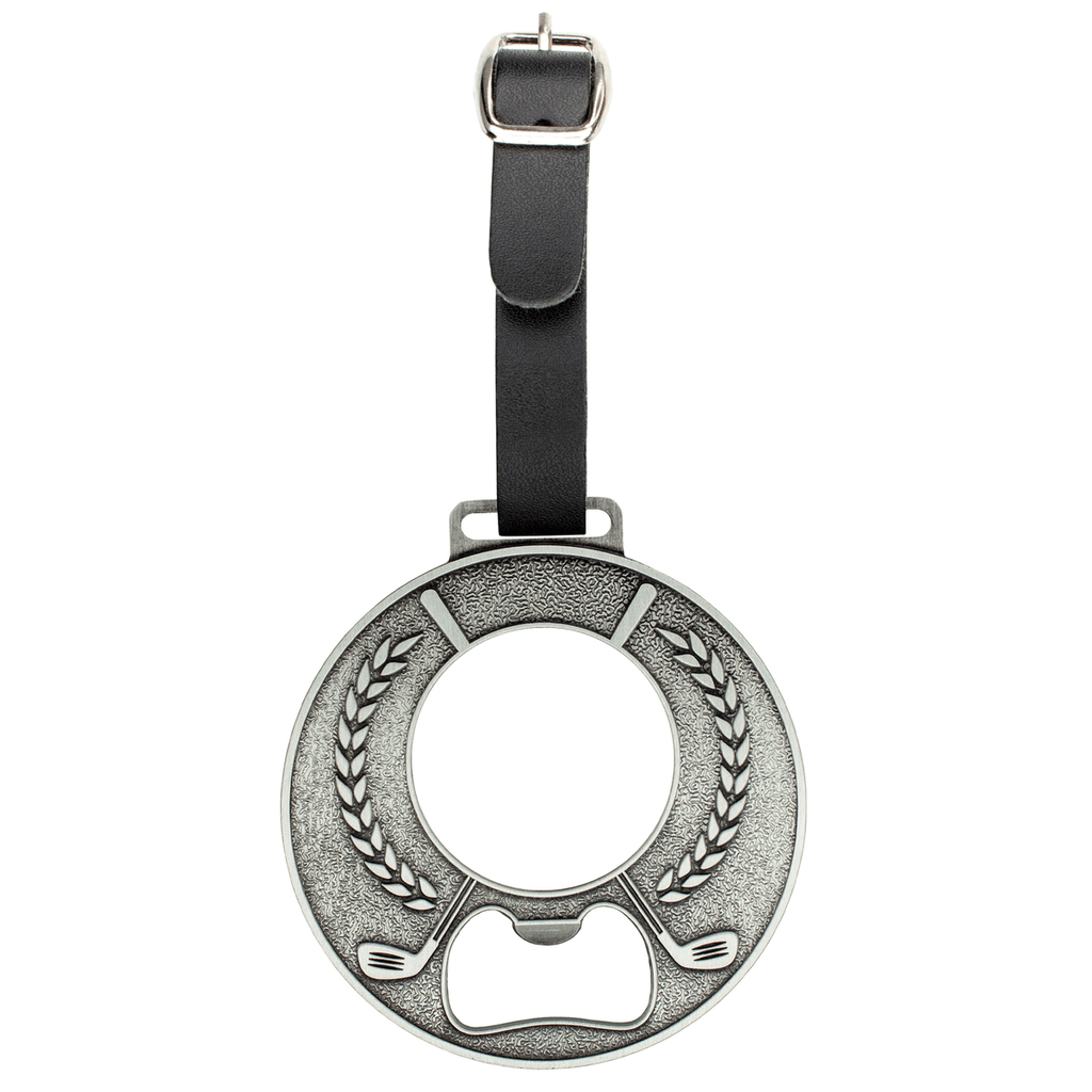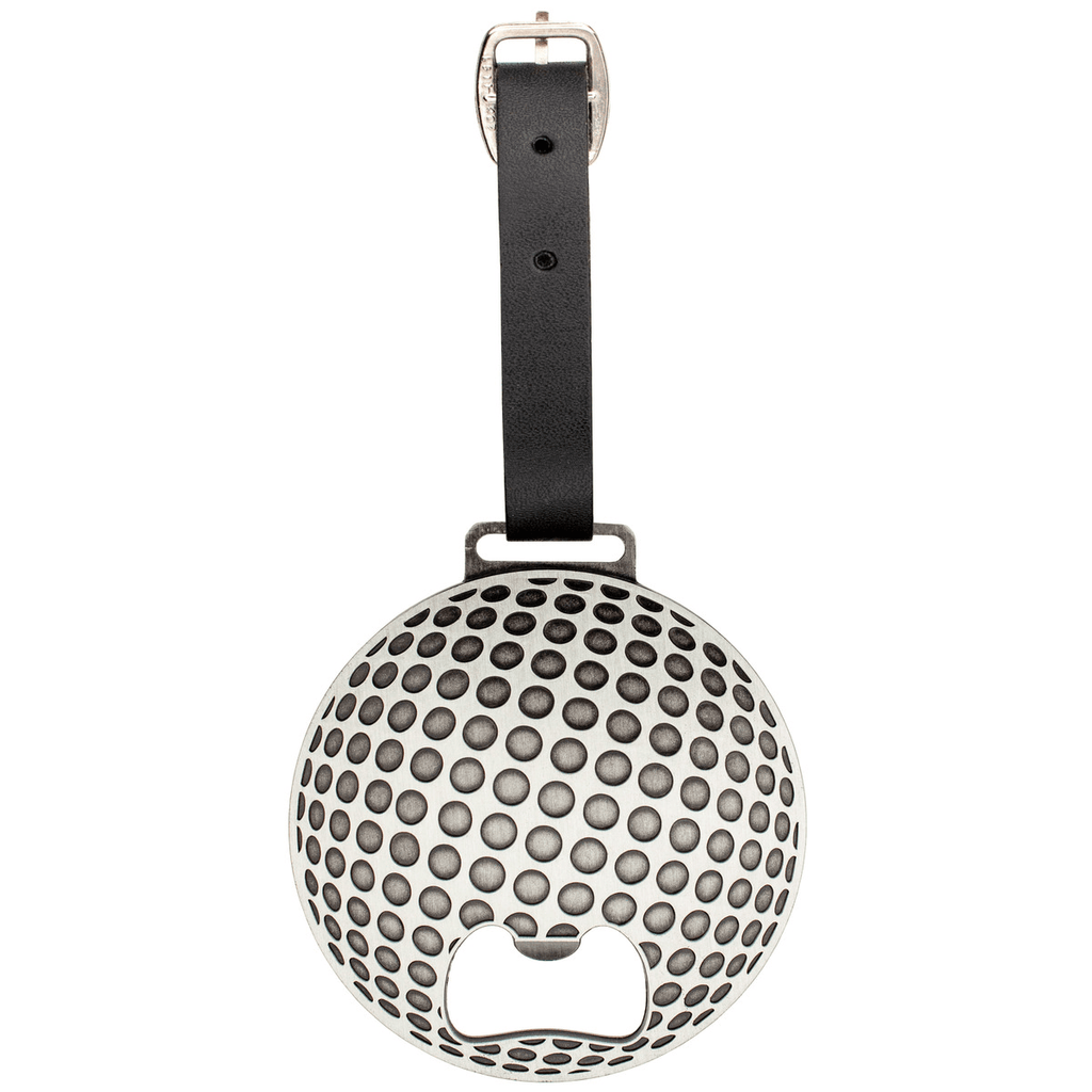 Brand your golf bag! This two-sided die cast bottle opener features antique nickel finish, an integrated bottle opener, and golf ball pattern on the back side. Includes leather strap with metal buckle for attaching to golf bags, luggage and more. Includes a full color imprint with protective poly dome. Perfect for golf tournaments and outings.