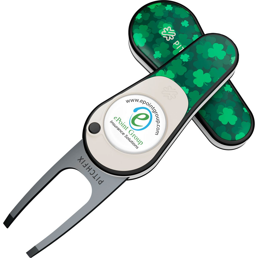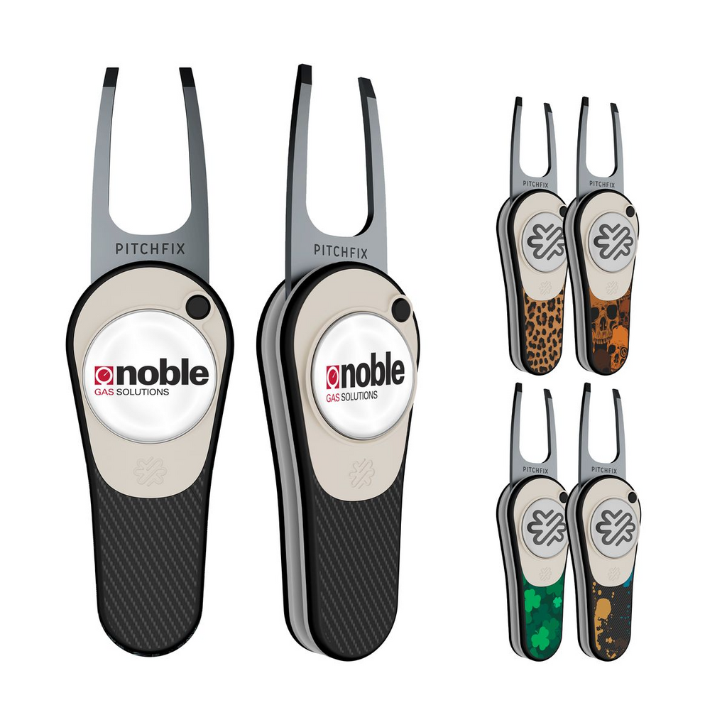 Pitchfix golf divot repair tools feature the patented Pitchfix switchblade function and removable golf ball marker with full color dome imprint. Perfect for golf tournament sponsorships, giveaways, and outing gifts.