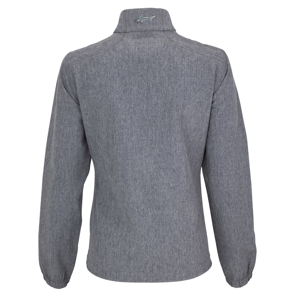 Easy-care, lightweight wind jacket gets 5-star reviews for style, comfort, and function. Made of 93% polyester/7% spandex, stretch heather dobby with water-repellent and UV protection, shark logo printed at back neck.