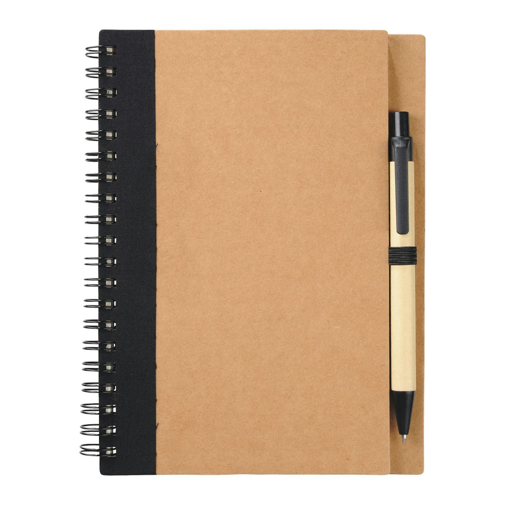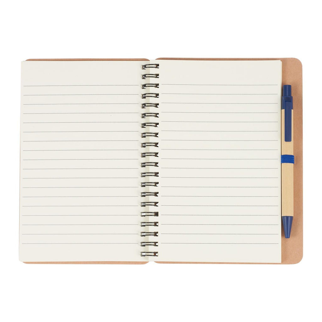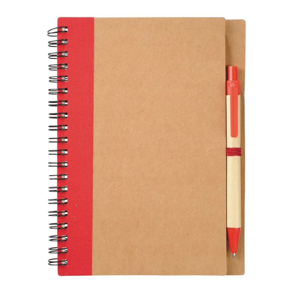 The 5" x 7" Eco Spiral Notebook with Pen features 60 ruled pages, a matching color elastic pen loop and a matching ballpoint pen. A pen imprint is not available and all pens are packed separately.
