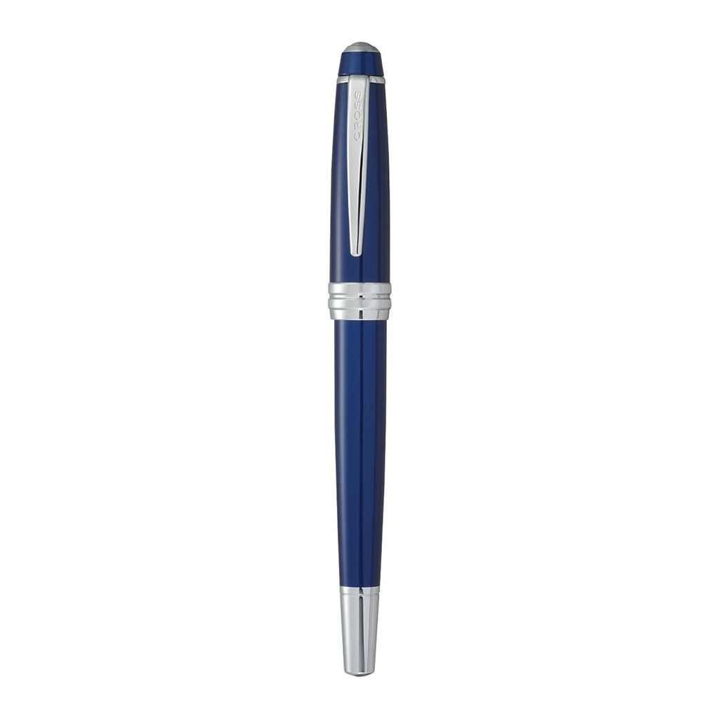 A simple articulation of modern Cross design, this elegant writing instrument features a traditional well-balanced profile in a selection of sophisticated finishes. A multi-grooved center ring with deep-cut engraved accents adds just the right amount of flair. Blue lacquer finish with polished chrome appointments. Click-off cap design and exclusive black gel ink roller ball tip. Includes Cross® gift box and limited mechanical guarantee. Medium pen tip.