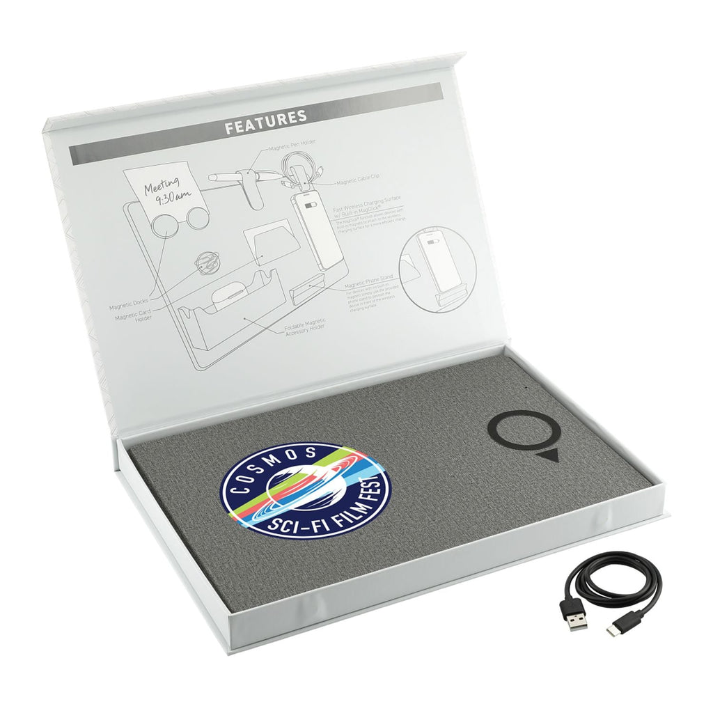 The MagClick™ Fast Wireless Charging Desk Organizer includes a clipboard, three magnetic docks, one foldable accessory holder, one card holder, one pen clip, one cable clip and one foldable phone stand, making it easy to organize your desk. The board has wireless charging area that magnetically attaches to iPhone 12/13/14/15 models for wireless charging. Using the foldable phone stand, other smartphones can be charged wirelessly. Supports three different wireless charging modes: 7.5W for iPhone 8/X/11/12/13/14/15 Series; 10W for Samsung Galaxy S9/S9 Plus/S8/S8 Plus/Note 8/9 and more, and 5W standard charging for all other enabled devices. Includes a 39-inch USB-A-to-Type-C charging cable. It is recommended to use a quick-charge power adapter (10W at least, not included) to achieve fast charging. Packaged in a premium gift box.