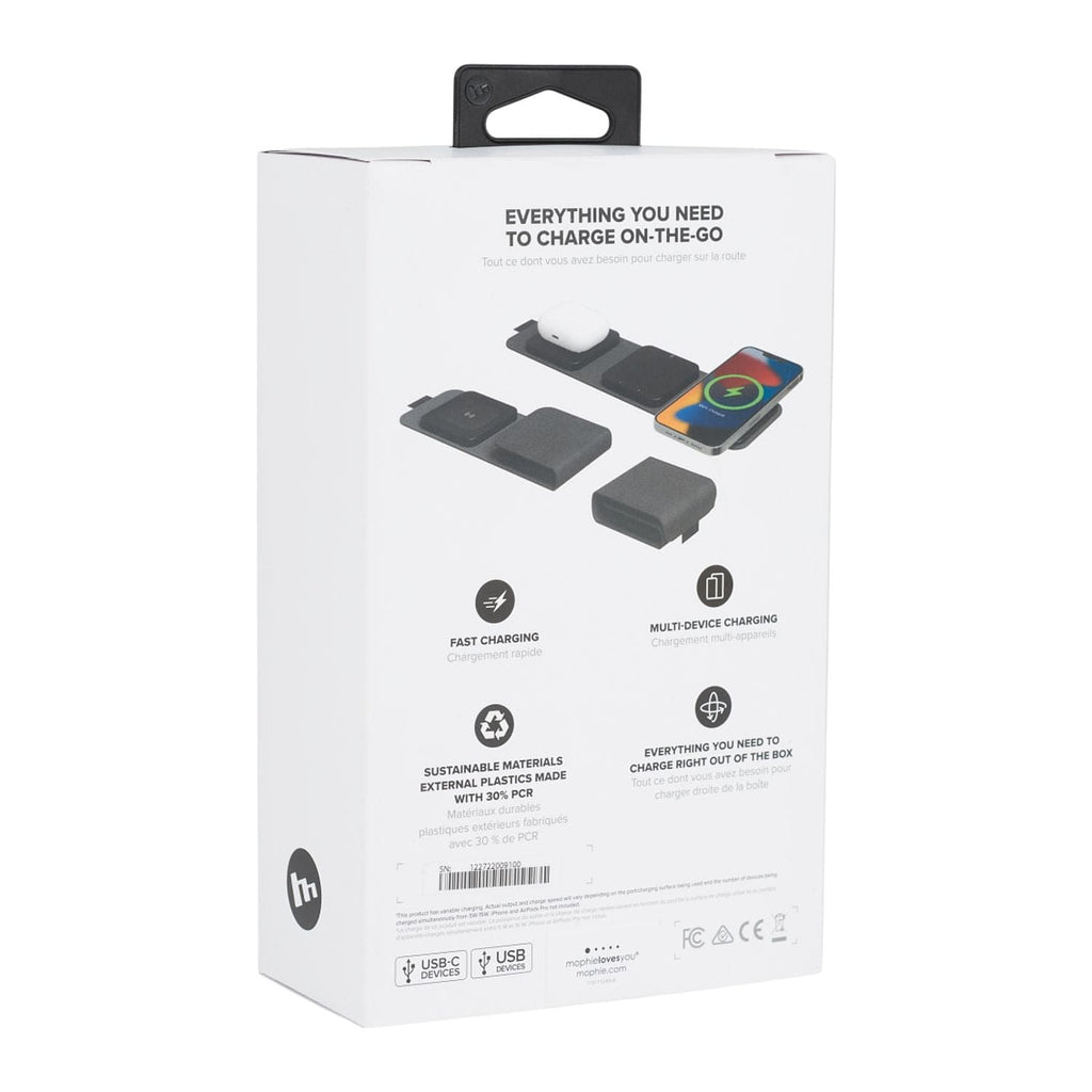 The mophie® Snap + Multi-device Travel Charger has built-in magnets that are MagSafe/MagClick compatible, so your devices could snap into the ideal position for wireless charging on contact. It delivers up to 7.5W to iOS devices and up to 15W to Android devices. The designated Airpods charging spot could deliver up to 5W of power to your Airpods or TWS earbuds with wireless charging capability. You can charge a third and fourth device with up to 10W using the additional USB-C and USB-A ports. The included snap adapter can easily attach to the back of a non-MagSafe compatible iPhone or any other smartphones. 30W USB-C wall charger and USB-C to USB-C cable included. All are wrapped up in one foldable travel case.