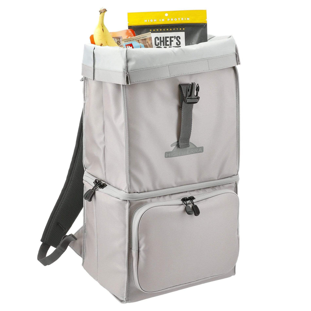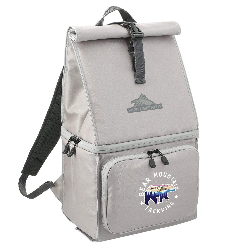 The High Sierra 12 Can Backpack Cooler is the perfect balance for an all-in-one bag/cooler combo. The top section is a non-insulated compartment with a roll top opening. The bottom compartment is a fully-lined cooler compartment for drinks and snacks. The outer material and cooler lining are both wipe able.