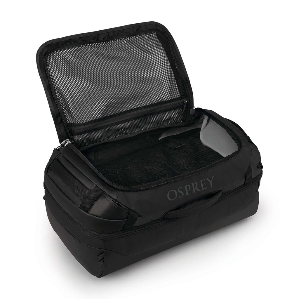 Dual entry duffel featuring both 50/50 clamshell access and traditional top-loading style with rollaway dividers