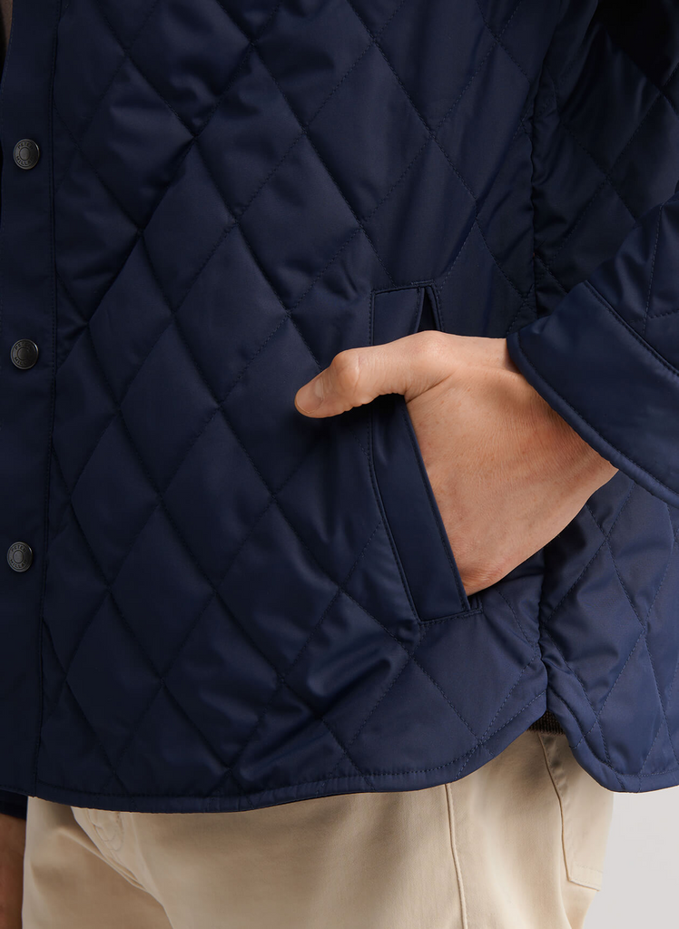 A casual twist on our classic quilted outerwear, expressed with a fresh elongated diamond design and new silhouette. It features the same matte finish and water-resistant, windproof qualities as its more traditional counterparts in a new functional shirt jacket thats unlined and easy to layer.