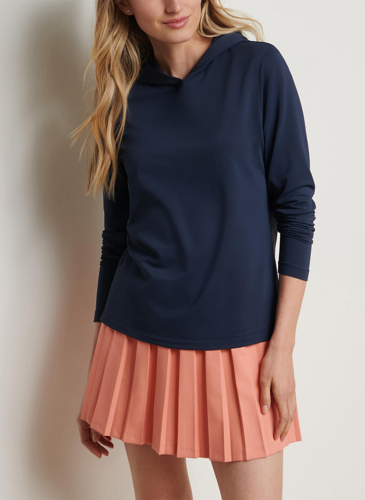 A casual silhouette with a streamlined design, this hoodie is shaped by a wicking stretch fabric with a smooth jersey exterior and lightly brushed terry back. Finished with a crossover hood and notched hem.