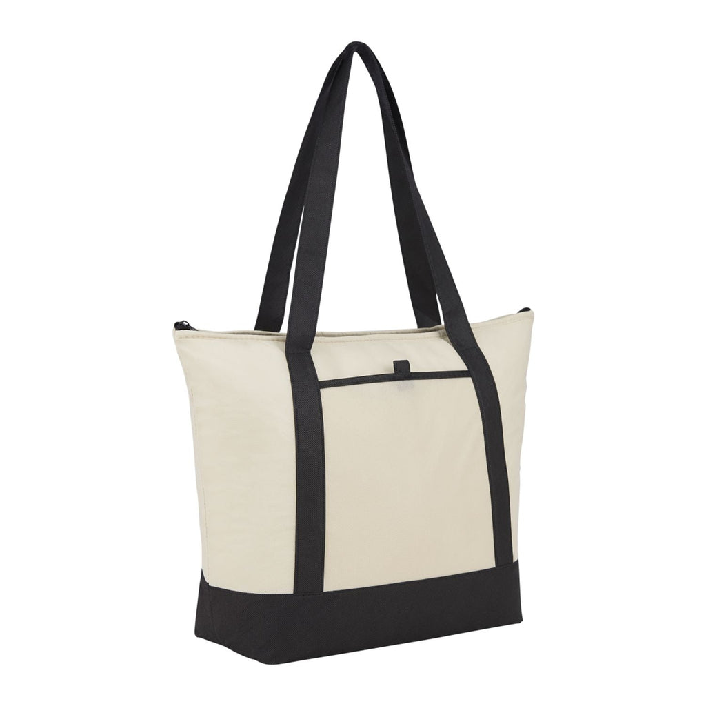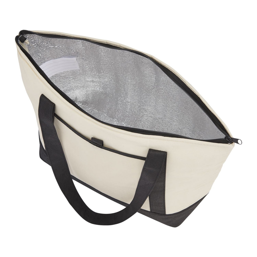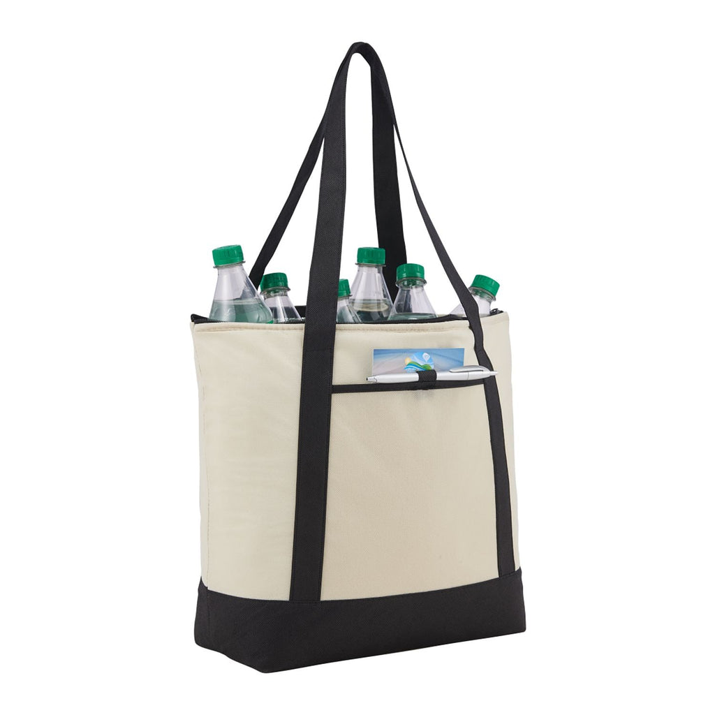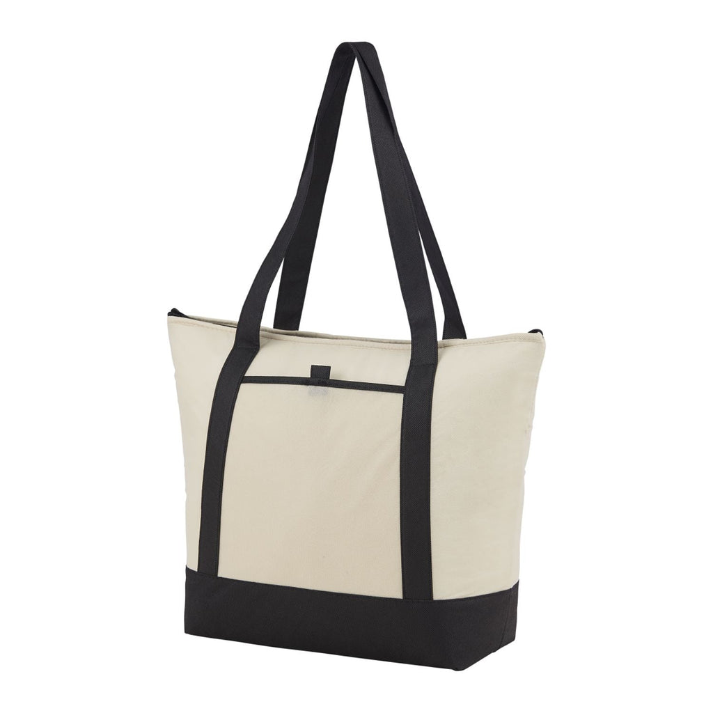 With a spacious foil-lined interior that accommodates up to two dozen 12oz cans, the Lighthouse 24-Can Non-Woven Tote Cooler is ideal for company outings and large group events. It has a zippered main compartment plus an open front pocket for even more storage, along with a built-in pen loop. Featuring comfortable 24" double-handles, this lightweight polypropylene bag is easy to carry anywhere.