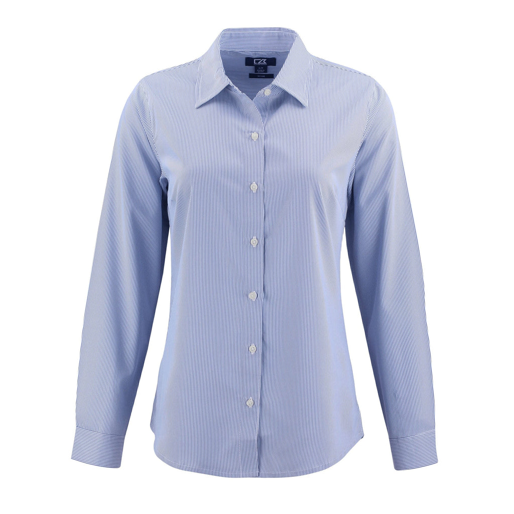 The iconic Skyline Epic Confidence Recycled Pinstripe Womens Long Sleeve Dress Shirt is engineered with innovative work-to-weekend performance fabric for exceptional versatility. Crafted to instill confidence, and engineered with high quality certified eco-friendly recycled polyester spandex weave for lightweight comfort and breathability, the Skyline will be your favorite womens patterned long sleeve dress shirt for work, travel, the big pitch, then happy hour. With the Skyline's PFAS free stain resistant finish and all-day recovery, you'll look and feel ready to create the next big thing.