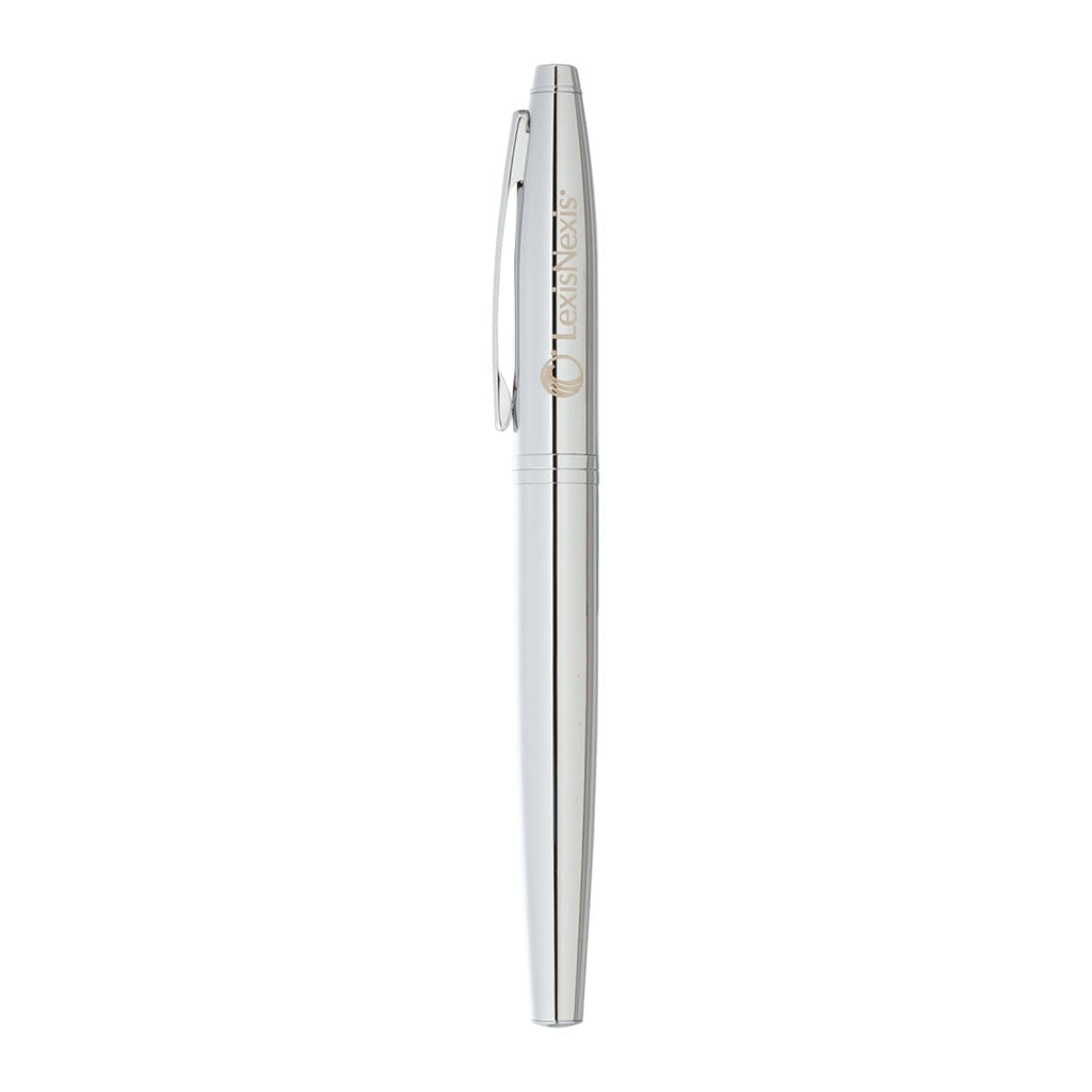 With Art Deco inspired lines and sophisticated finishes, the Calais Collection is an instant classic. Lightweight, sleek, with chrome accents and a bold profile, it brings a crisp, clean look to the table every time. Shiny chrome finish. Smooth gel black roller ball ink. Medium pen tip. Laser finish is shiny brass. Includes lifetime mechanical guarantee and signature Cross® gift box.