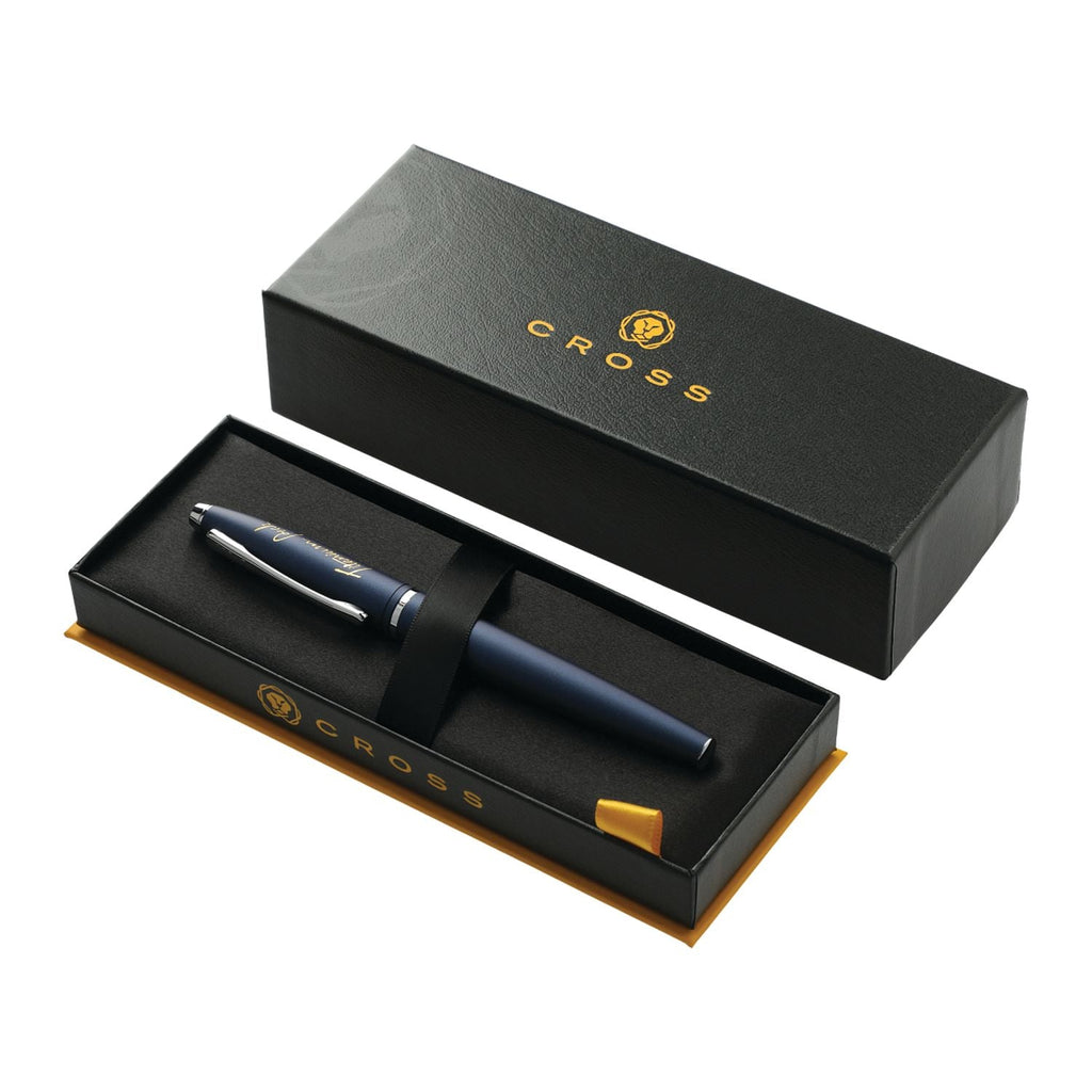 With Art Deco inspired lines and sophisticated finishes, the Calais Collection is an instant classic. Lightweight, sleek, with chrome accents and a bold profile, it brings a crisp, clean look to the table every time. Matte finish with polished accents. Smooth black gel roller ball ink. Includes lifetime mechanical guarantee and signature Cross® gift box. Medium pen tip. Laser finish is shiny brass.