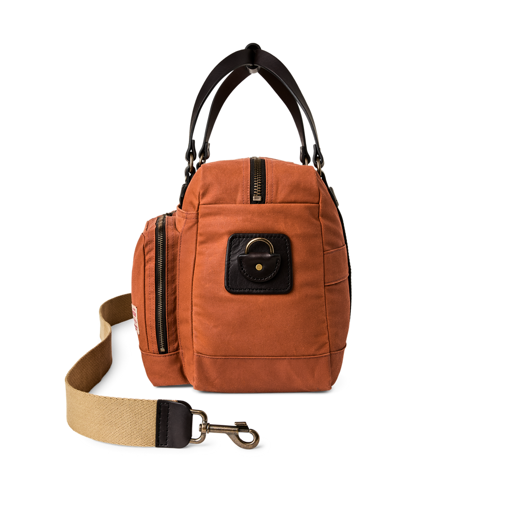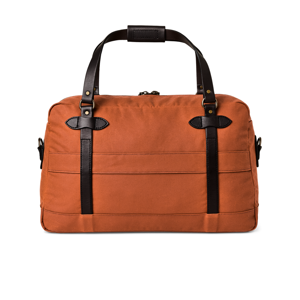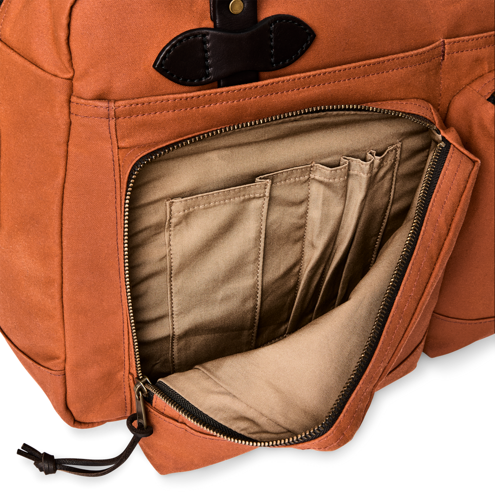 With a 34-liter capacity, our 48-Hour Duffle Bag is ideally sized for a long weekend. It is made from our waxed Tin Cloth, the iconic canvas that’s withstood the elements in rain-soaked backlands for a century. The main compartment is fully lined with unwaxed cotton to protect clothing and gear. The Bridle Leather handles with carry grip are made from thick vegetable-tanned leather that is strong enough for horse tack. Exterior zippered pockets keep quick-access essentials close at hand. The trolley strap on the back slides over the handles of rolling luggage for ease in navigating airport security. This bag meets airline carry-on size requirements, but if you do check it, the shoulder strap detaches to avoid snagging.