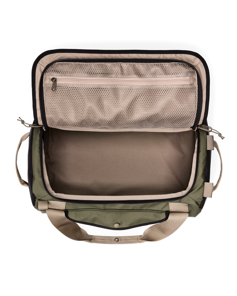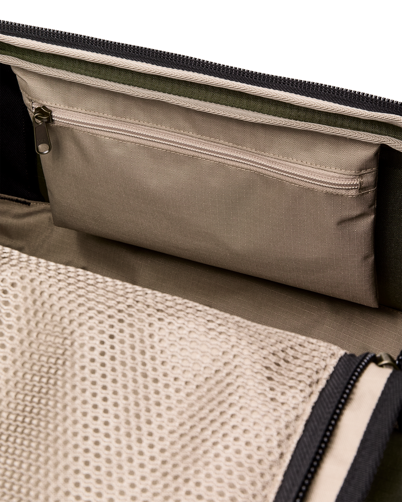 Padded, contoured shoulder straps with an adjustable sternum strap enable hands-free carry. They are removable to prevent snagging during transport. The full length of the main compartment's U-shaped zipper is covered by an extended storm guard for added water protection. The endcap grab handles and main carry handles are made from strong, durable nylon webbing. An interior zip-close hanging pocket and exterior snap-flapped pocket keep small essentials organized, and the entire top opening panel is covered with a zippered mesh pocket.