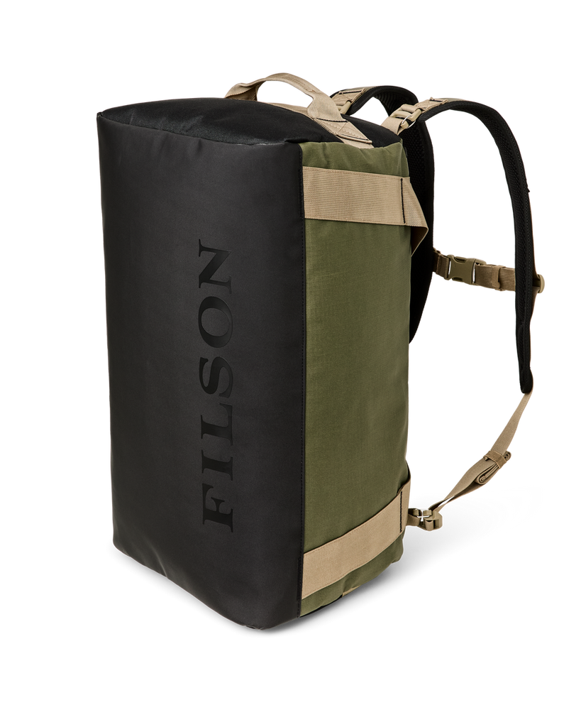 Sized for weekend excursions and built to protect gear through any weather. It's made with 100% recycled polyester fabrics treated with thermoplastic polyurethane (TPU) to prevent water entry. The main material is 300D ripstop, and the bottom boot 600D Oxford matte for added durability.
