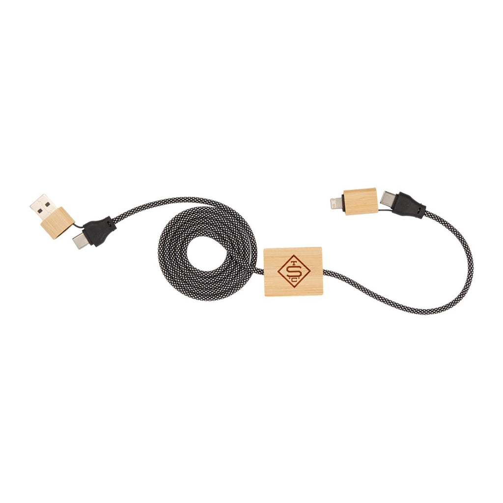 The FSC® 100% Bamboo 5-in-1 100W Laptop Charging Cable offers powerful, flexible charging with a thoughtfully designed sustainable touch. This 39.3-inch multi-device cable features a USB-A adapter and Type-C input tip on one end, with a dual-compatible 2-in-1 output tip on the other—compatible with both Apple iOS and Android devices. For high-speed charging, use the Type-C to Type-C configuration with a compatible AC adapter to achieve up to 100W output, ideal for charging laptops and other power-hungry devices. The housing is crafted from FSC® 100% certified bamboo, offering a stylish, natural finish while supporting responsible forestry. This cable is designed for versatility, portability, and a lower environmental impact.