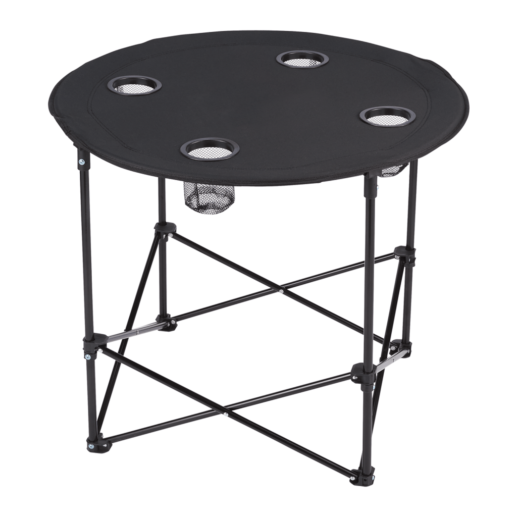 The Game Day Folding Table (4 person) is the perfect companion for your next tailgate or picnic. You can prominently display your logo at a tradeshow or company event on this round folding table while entertaining your guests. The Game Day Folding Table is lightweight, easy to transport and assemble/disassemble. It features a sturdy steel frame, durable 28.5" diameter 600D table top, and four (4) integrated mesh cup holders. Table-top height is 23.5" off the ground. Some assembly required.