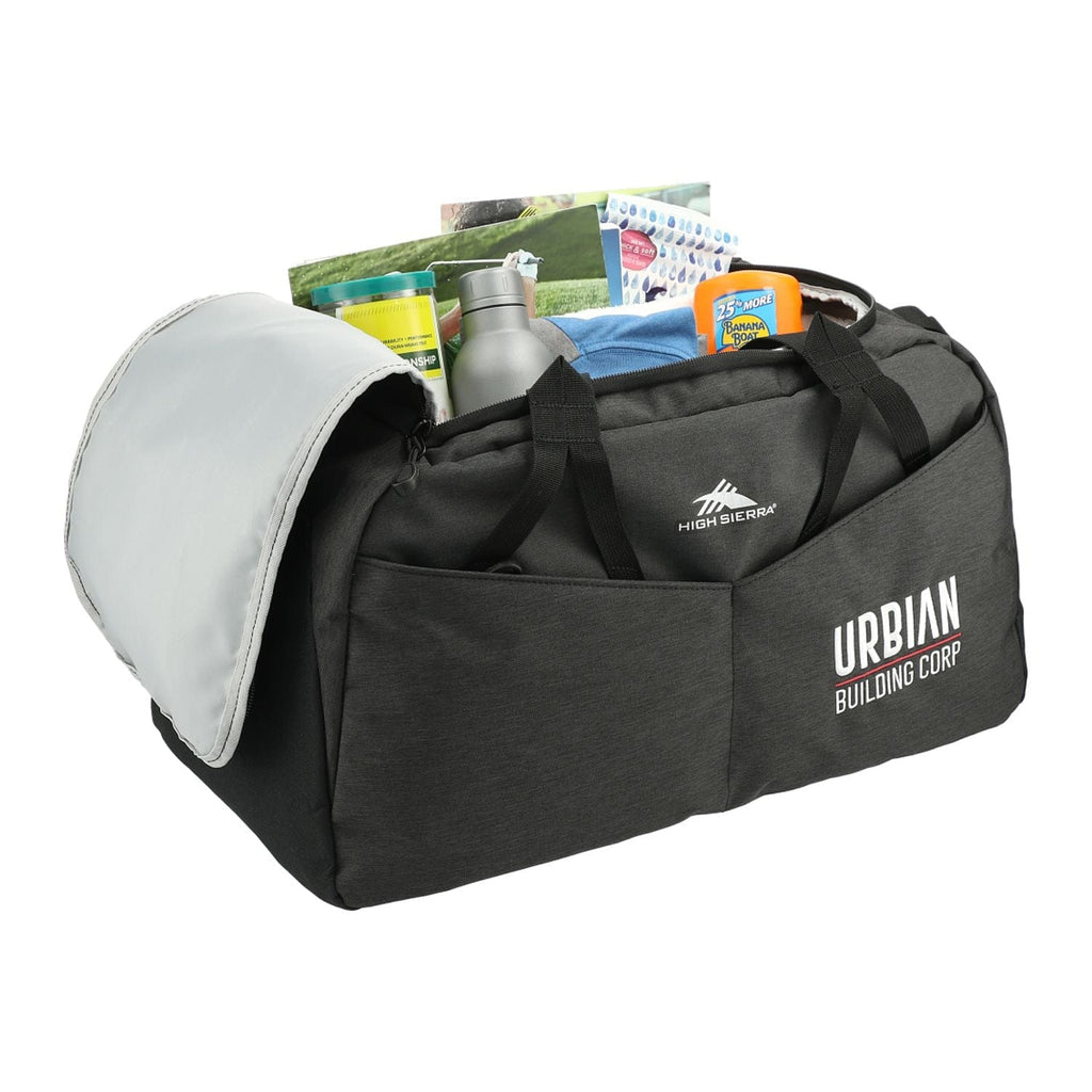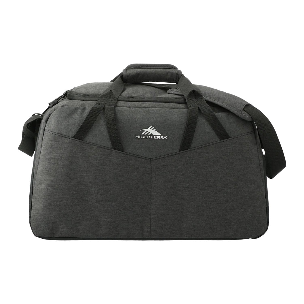 The High Sierra Forester RPET 22" Duffel is designed for all casual travel needs. This duffel features a roomy single compartment design with large U-shaped opening for easy access. The front stash pocket and exterior pockets with organization add extra storage for your must-have items. This duffel is made from water resistant fabric and features a wipe clean interior. Carry using the top grab handles or the adjustable, padded shoulder strap.