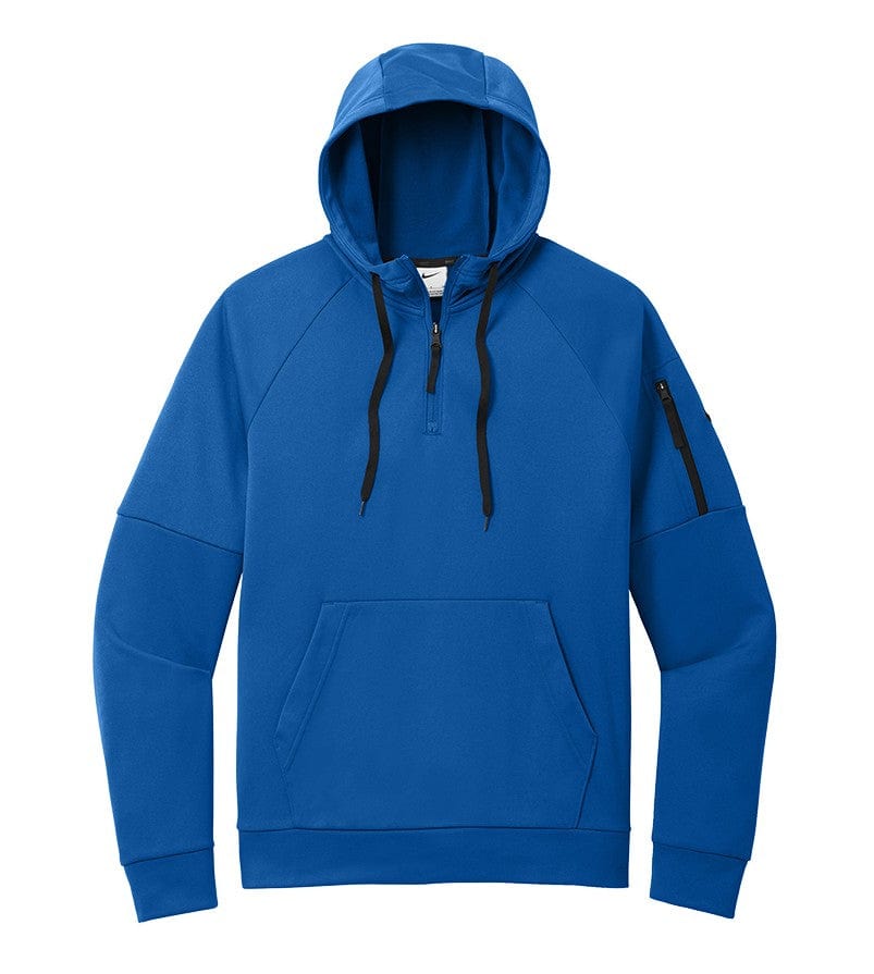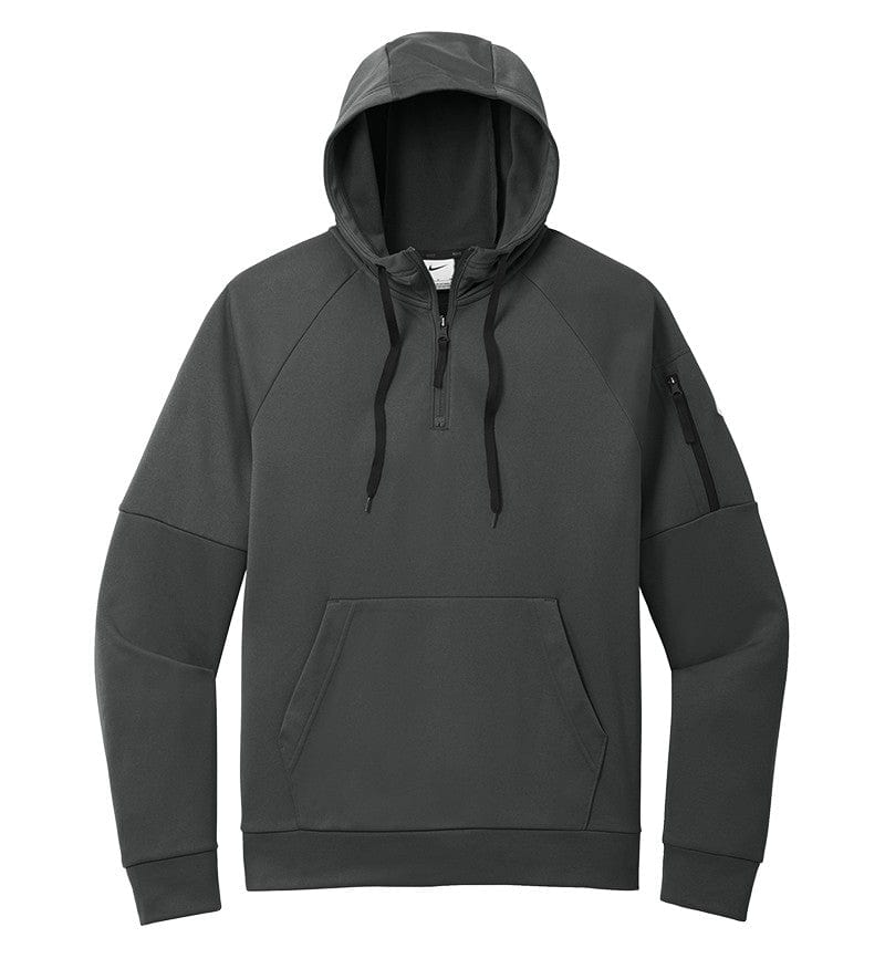 This 1/4-zip hoodie with a zippered left arm pocket brings the heat to your workout with Therma-FIT fabric. Therma-FIT helps manage your body’s natural heat to keep warm in cold-weather conditions. The design includes a three-panel hood with black drawcords, a dyed-to-match zipper and a front pouch pocket. Self-fabric cuffs and hem. A contrast Swoosh logo is embroidered on left sleeve. A contrast Therma-FIT logo is embroidered on back hem. Made of 7.4-ounce polyester Therma-FIT fabric.